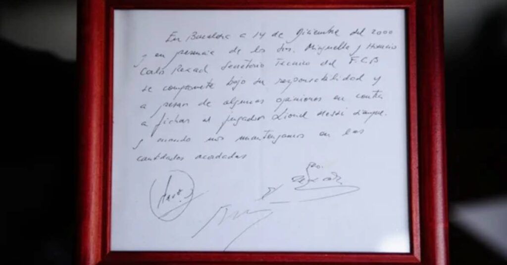 ယင်းစာချုပ်မှာ ၂၀၀၀ ပြည့်နှစ် ဒီဇင်ဘာ (၁၄)ရက်တွင် ဘာစီလိုနာမြို့၌ ဘာစီလိုနာအသင်း ဒါရိုက်တာ ကားလ်ရီဆက်ချ်၊ အပြောင်းအရွှေ့ဆိုင်ရာအကြံပေးသူ ဂျိုးဆက်မင်ဂယ်လာ၊ မက်ဆီ၏အေးဂျင့်ဖြစ်သူ ဟိုရာစီယိုဂက်ဂျီယိုလီတို့ လက်သုတ်ပဝါတွင် ရေးသား၍ လက်မှတ်ရေးထိုးထားခြင်းဖြစ်သည်။